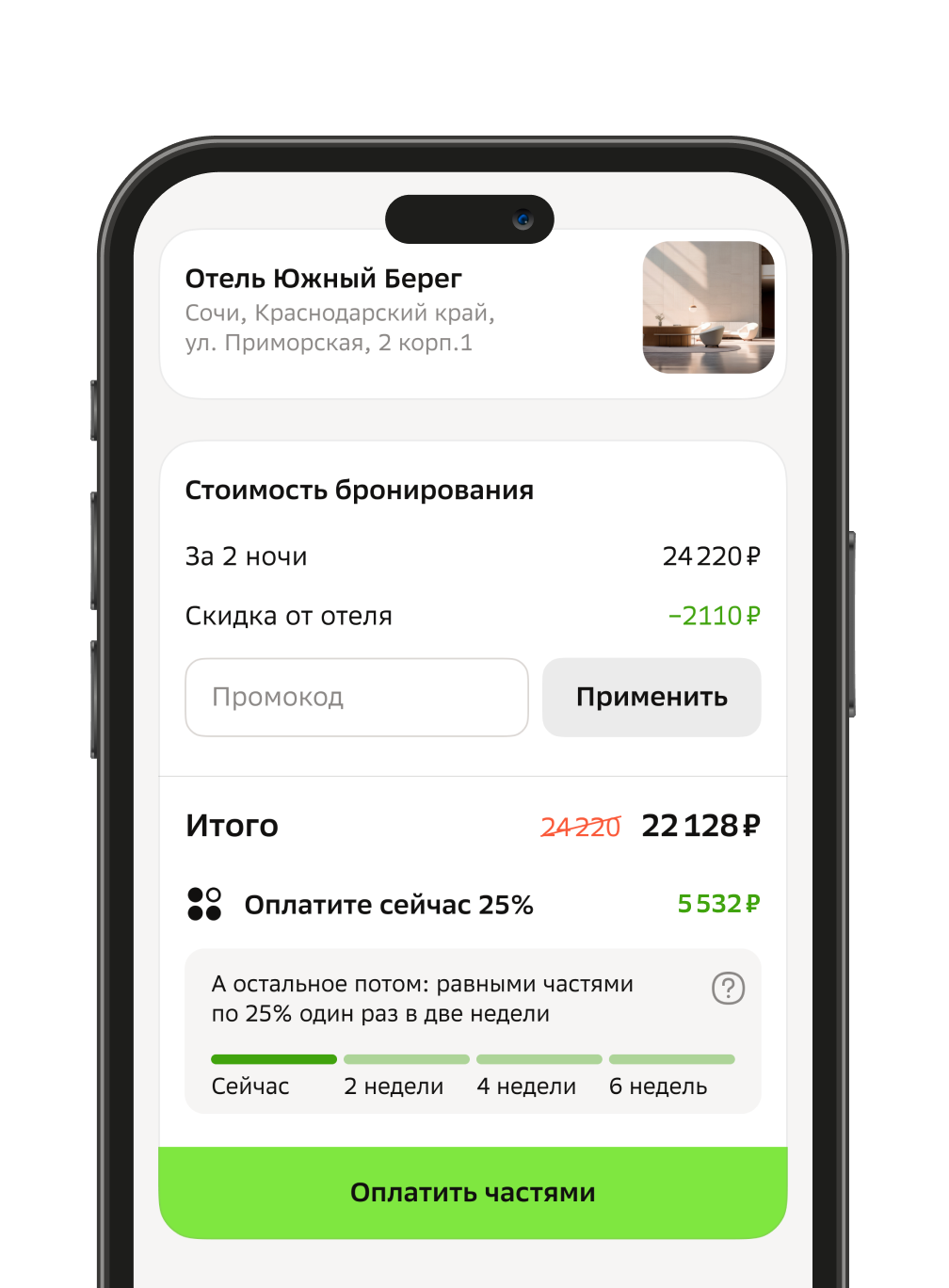 Сервис «Плати частями» предоставляется ООО «Центр новых финансовых сервисов» (ООО «ЦНФС», ОГРН 1 227 700 098 009) и не является кредитом. Срок выполнения обязательств клиентом — от 1,5 до 6 месяцев. Решение о предоставлении Сервиса принимается ООО «ЦНФС». Плата за пользование Сервисом не предусмотрена (за исключением услуги по увеличению срока выполнения обязательств). Подробнее с условиями сервиса вы можете ознакомиться на сайте platichastyami.ru.